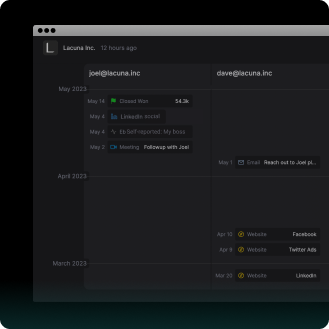 HockeyStack tracks individual customer journeys, then places them inside an account-level journey where you can visualize each independent journey side by side in chronological order. Track customer journey touchpoints, from first touch to closed/won, of every account in Salesforce.